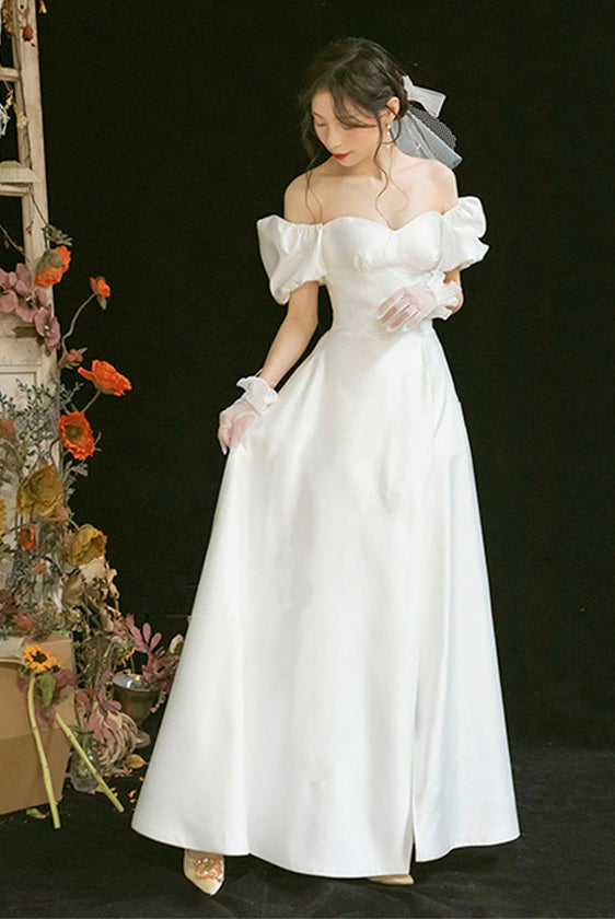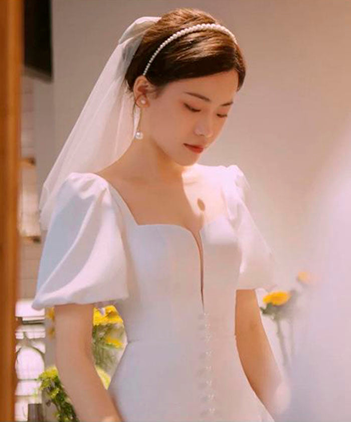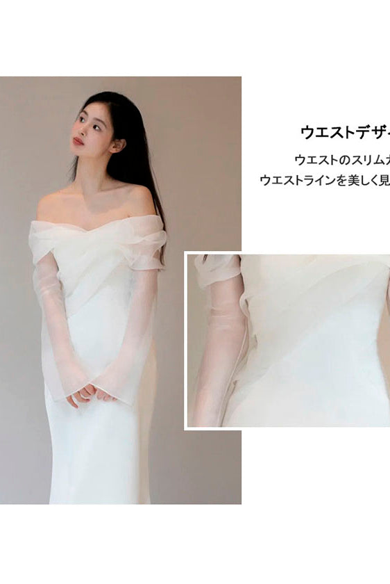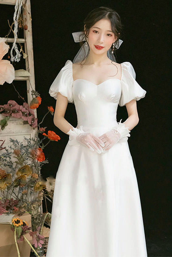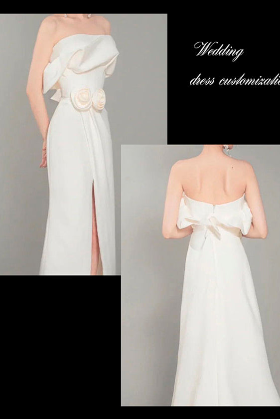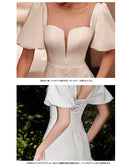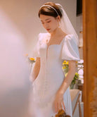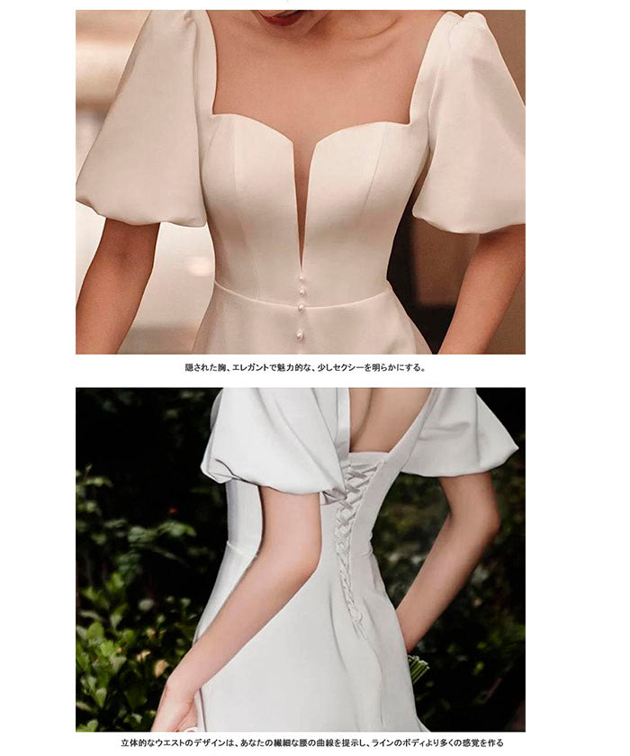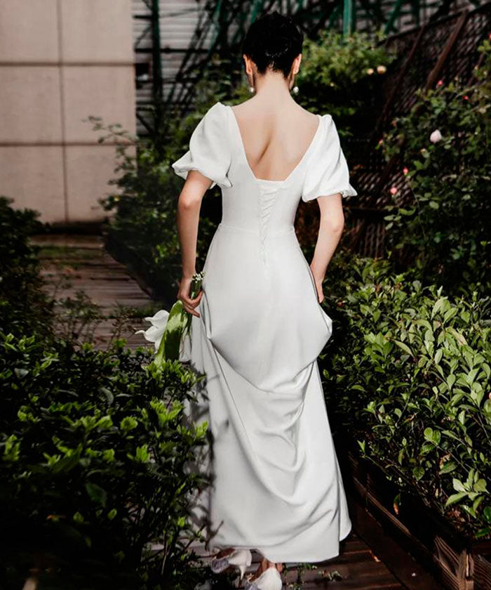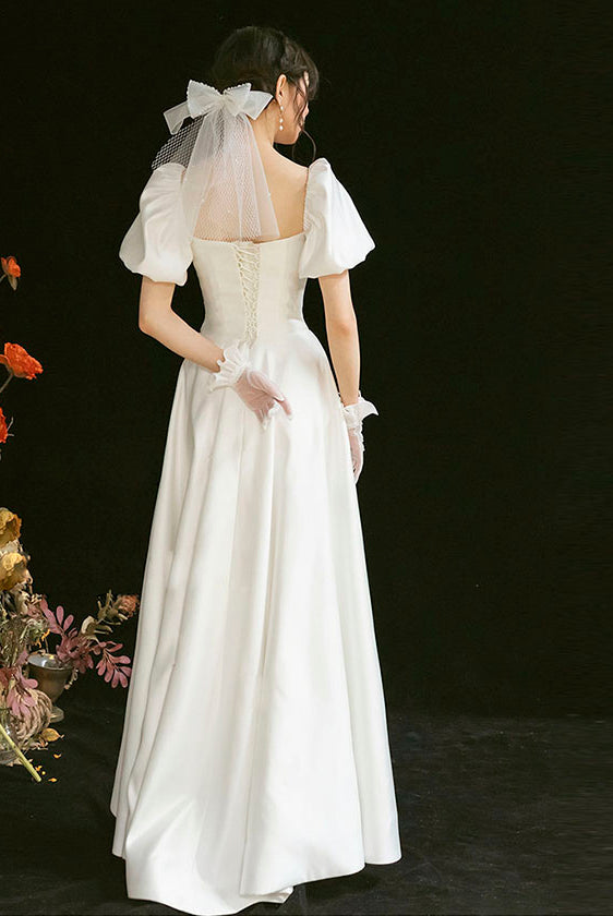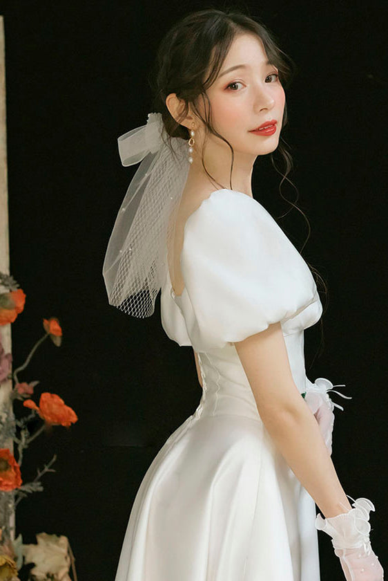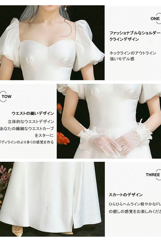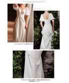 フランスのシンプルで軽いウェディングドレス、レトロなサテン、新しいスタイル、旅行写真、女性用の白いドレス