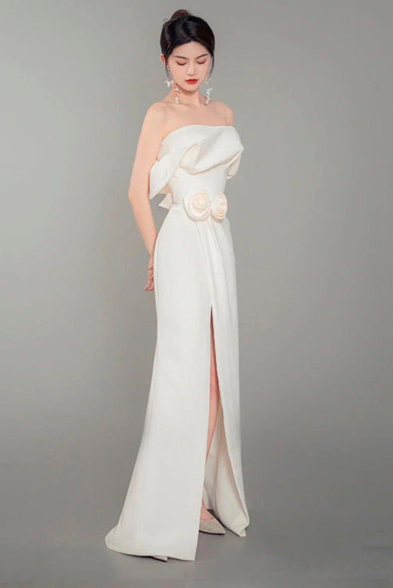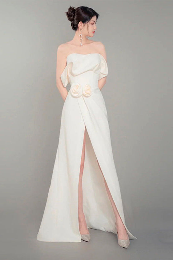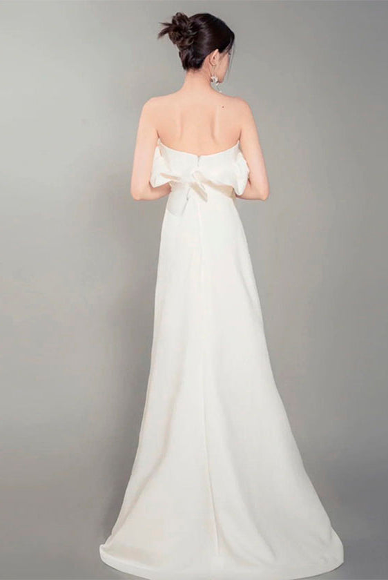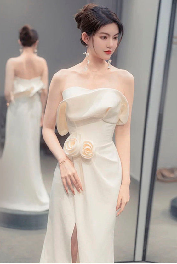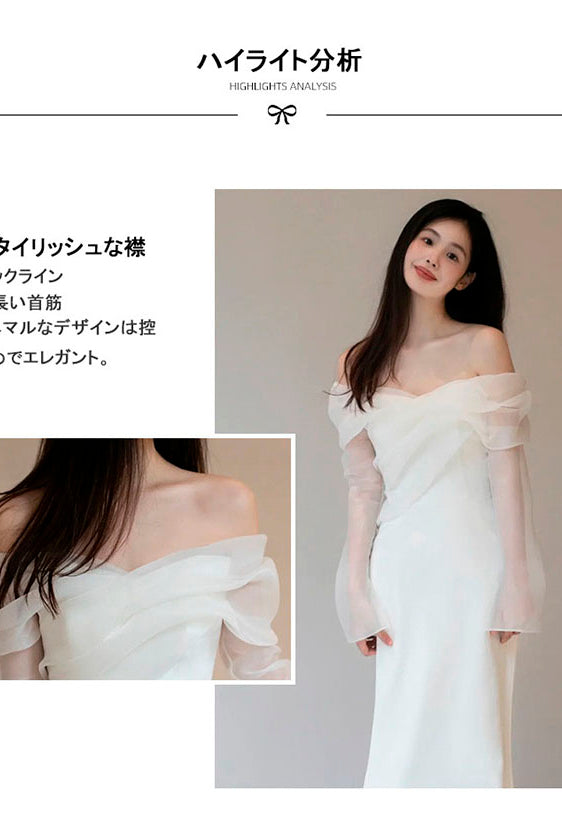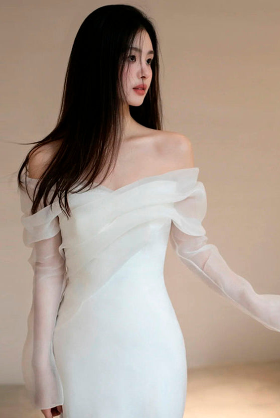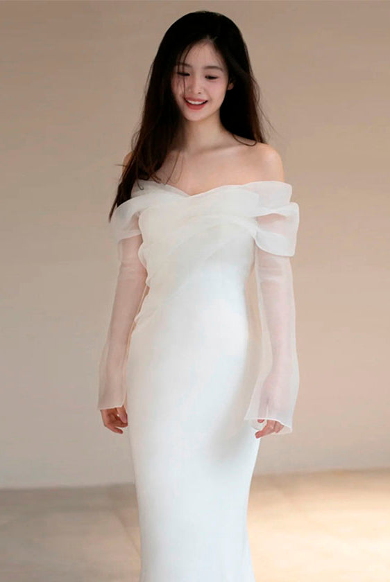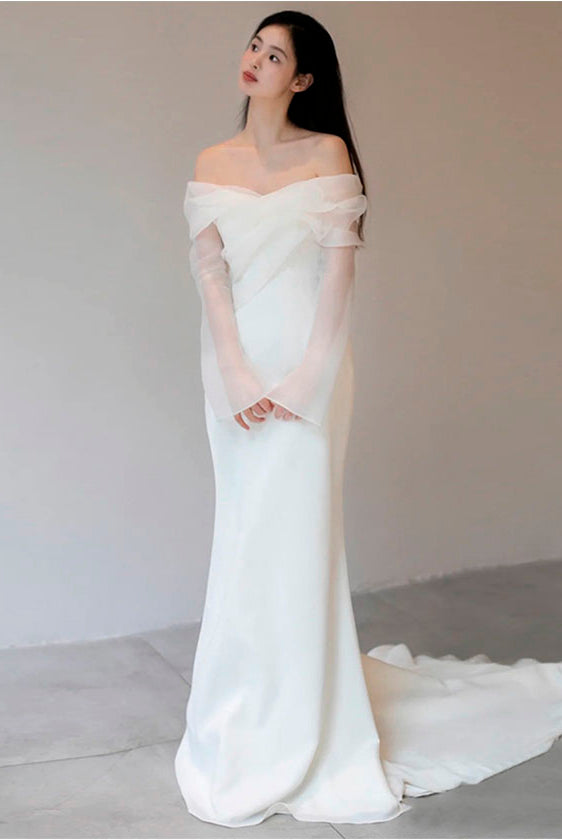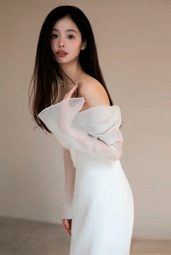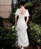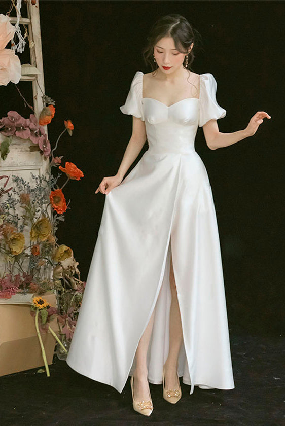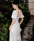 フランスのシンプルで軽いウェディングドレス、レトロなサテン、新しいスタイル、旅行写真、女性用の白いドレス