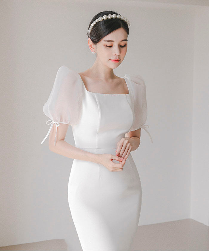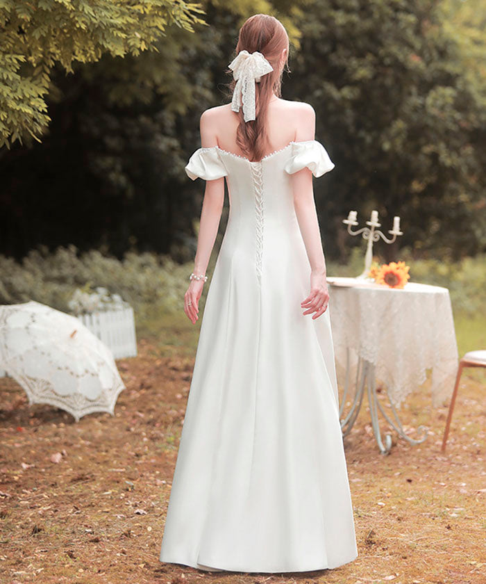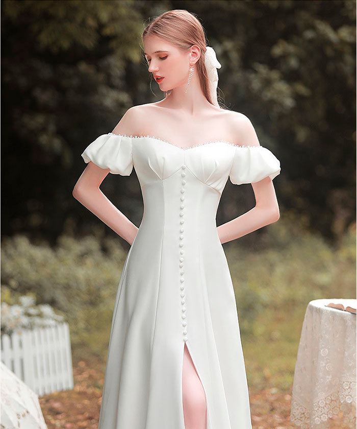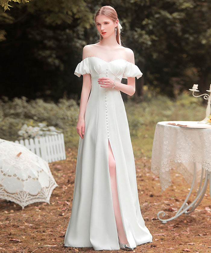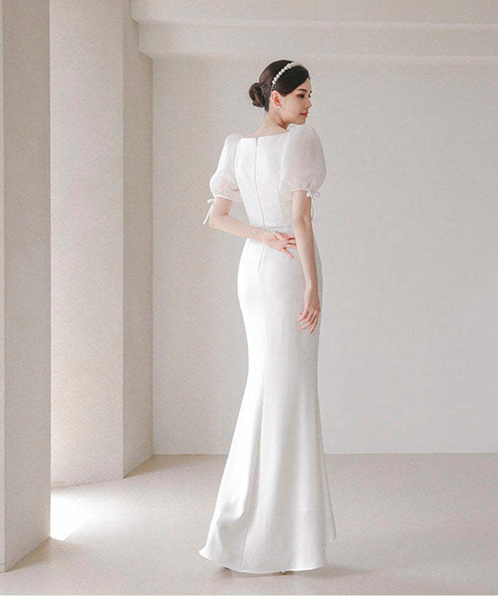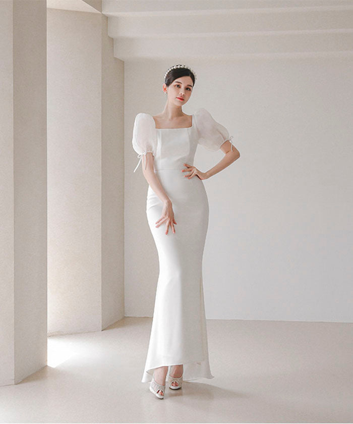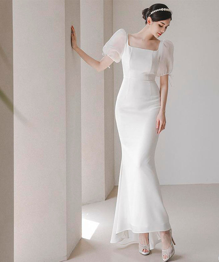 フレンチ サテン ライトウェディング ドレス フィッシュテー ウェディングドレス ホワイト シンプル スリム セクシー ワンショルダー イブニングドレス