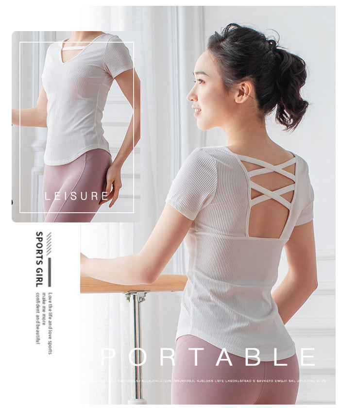 長袖ヨガトップ、背中の開いた短いスポーツウェア、フィットネスウェア、ダンスウェア、シンプルなクロスオーバーバック美しい薄いヨガウェア、痩身ピラティス