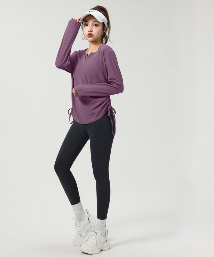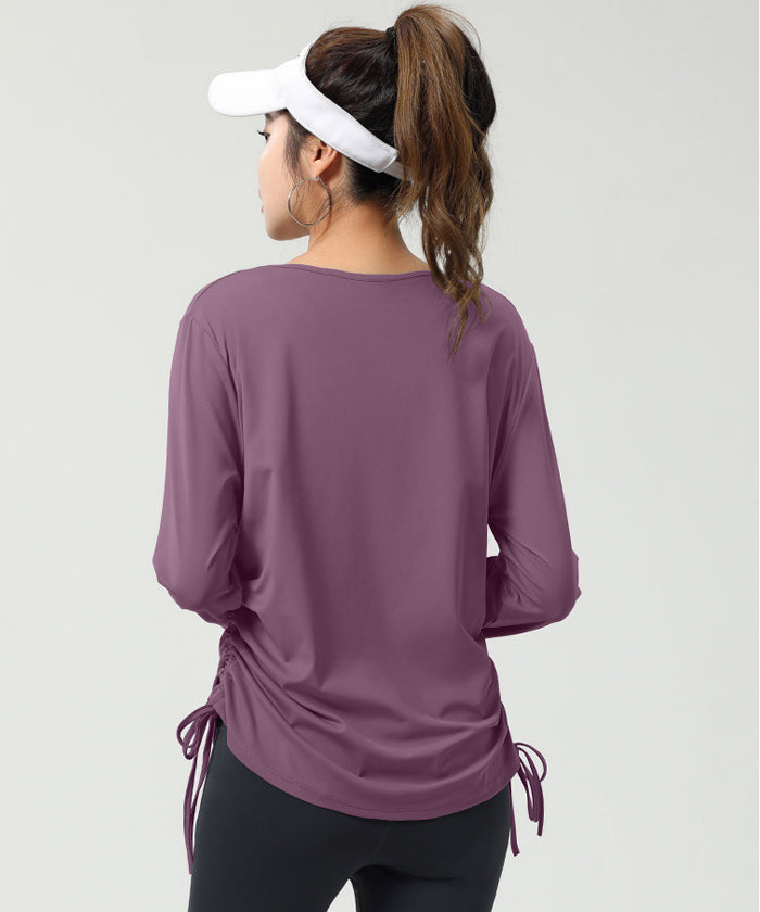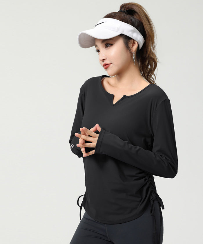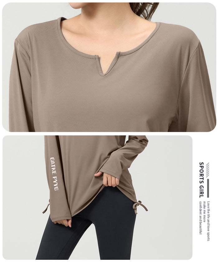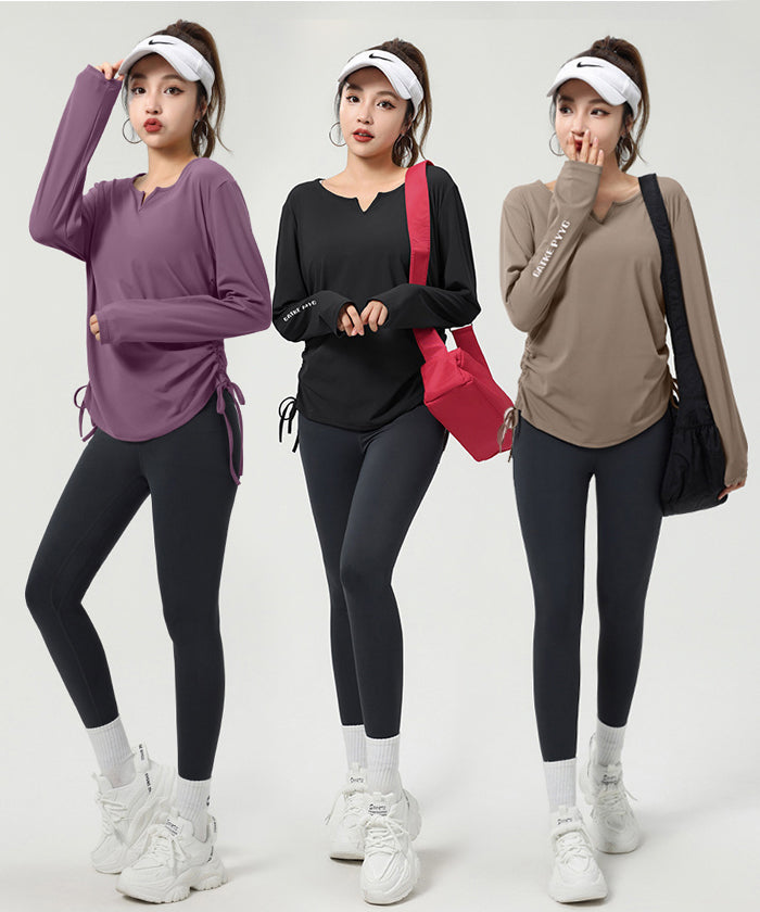 ヨガウェア トップス、ウエストレスフィットネスウェア、長袖スポーツトップス、ドローストリング、高伸縮性、スリムフィットで美しい背中、レディースフィットネスウェア