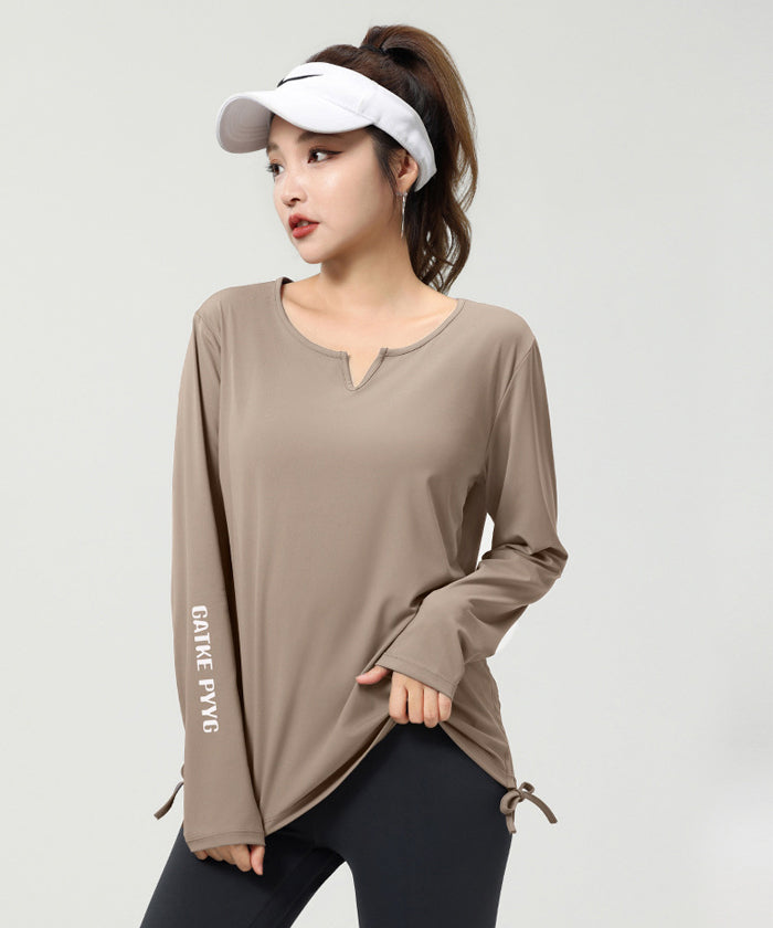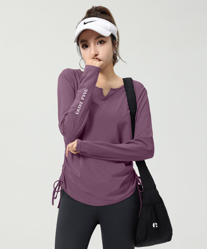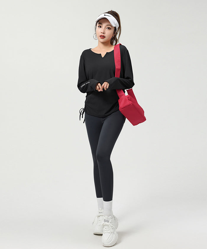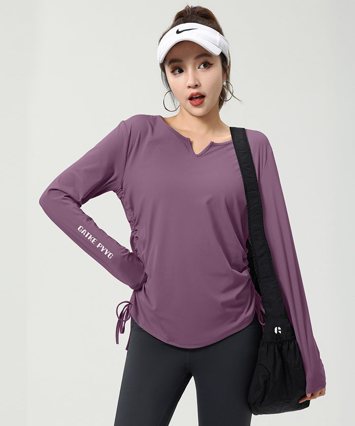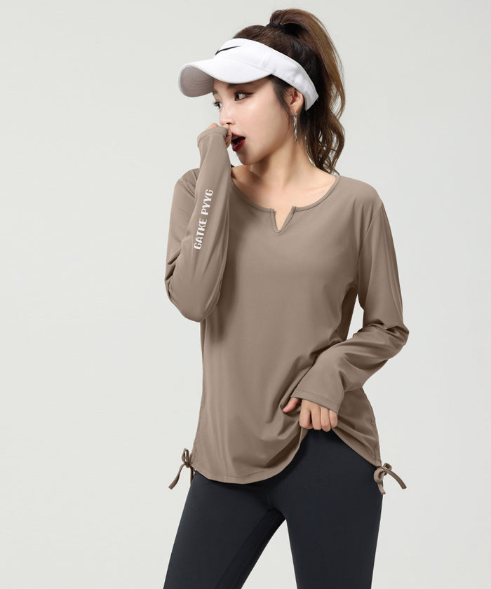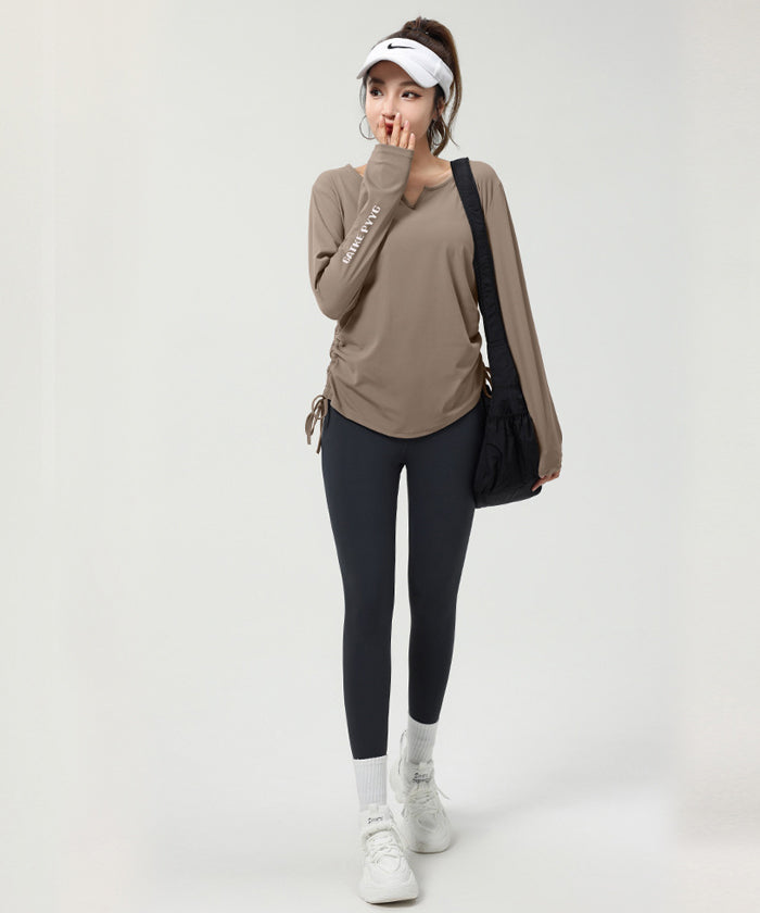 ヨガウェア トップス、ウエストレスフィットネスウェア、長袖スポーツトップス、ドローストリング、高伸縮性、スリムフィットで美しい背中、レディースフィットネスウェア
