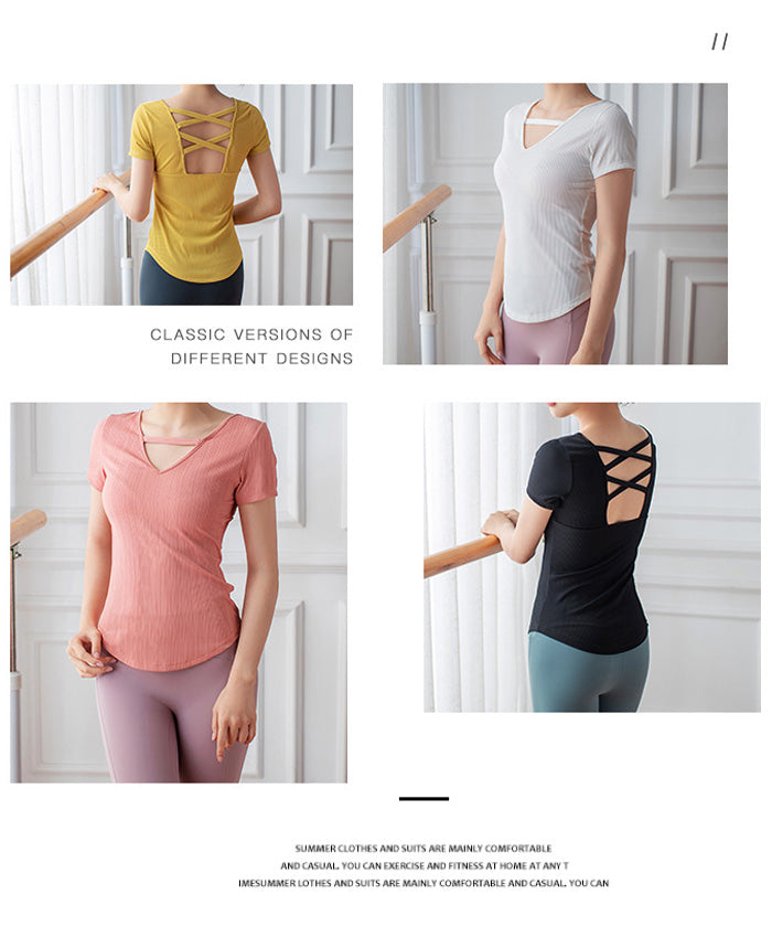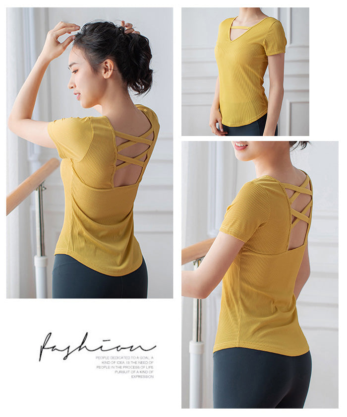 夏 新作 半袖 ヨガトップス ショート丈 スポーツウェア フィットネスウェア シンプル 束腰クロス 美背中 薄手 ヨガ服 スリムフィット ピラティス