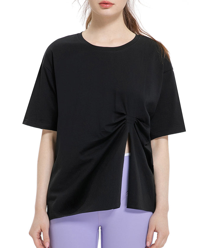 吸湿発散性に優れた高品質な生地を使用したヨガ半袖Tシャツトップです。汗を素早く吸収・発散し、常にドライで快適な状態を保ち、汗による不快感を防ぎます。高強度のヨガの練習中に最大限の快適さを提供し、身体的および精神的なバランスに集中できます。