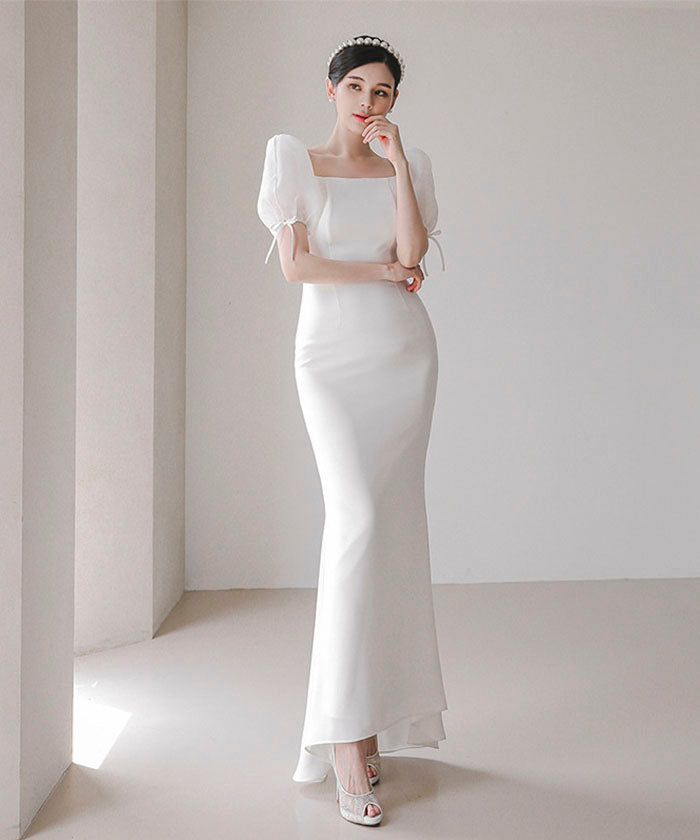 ウェディングドレス スクエアネック パフスリーブ スリム ホワイト ライト ウエディングドレス フレンチ サテン シンプルライト
