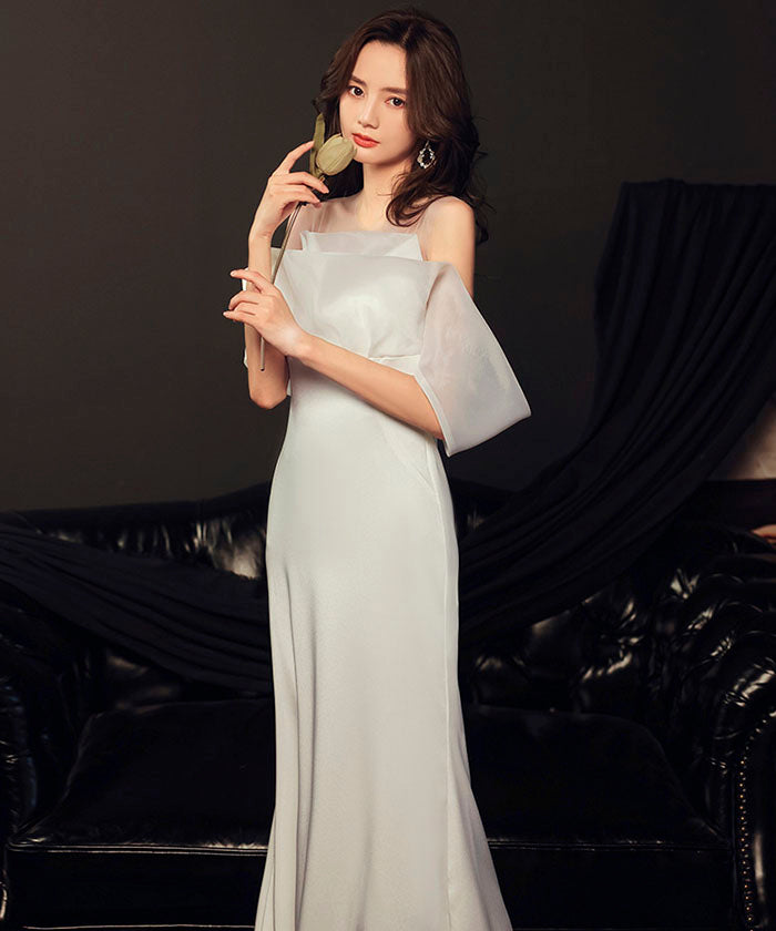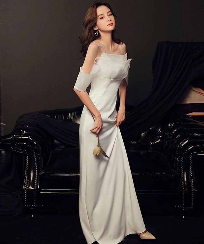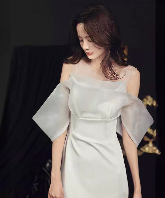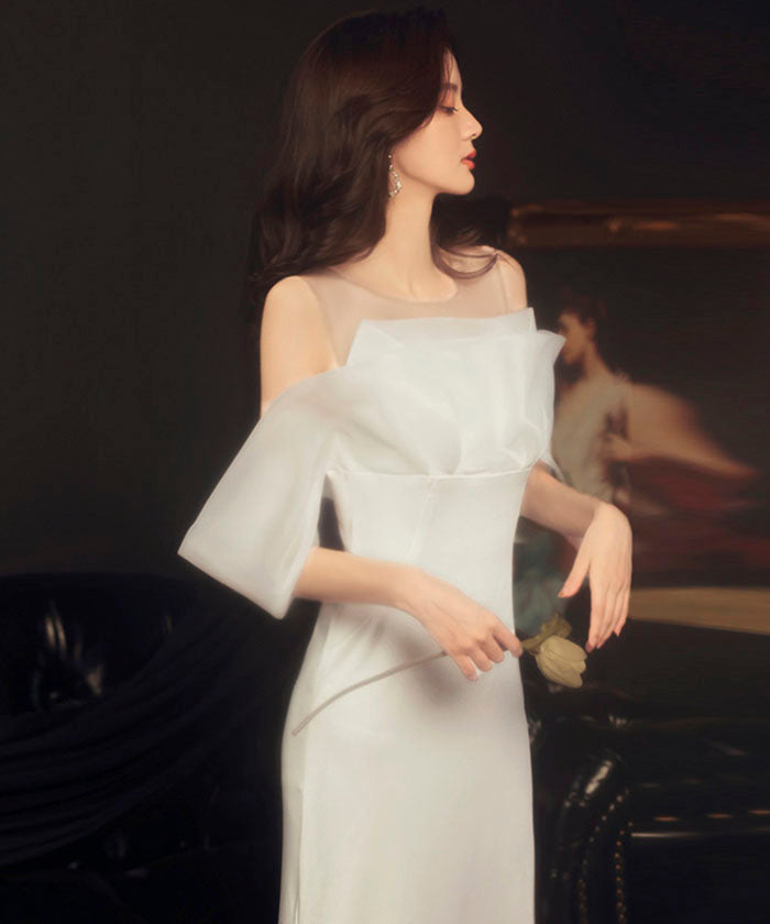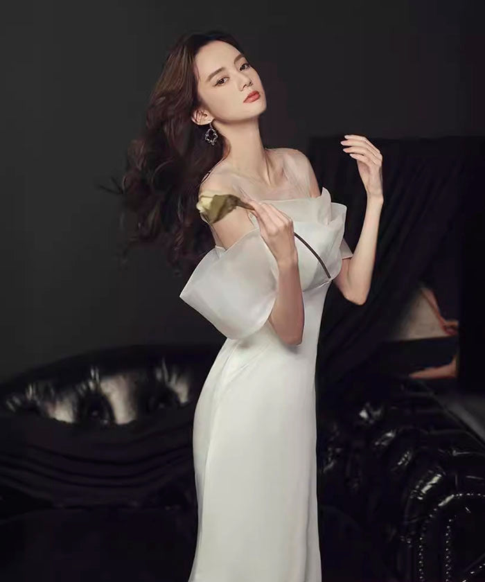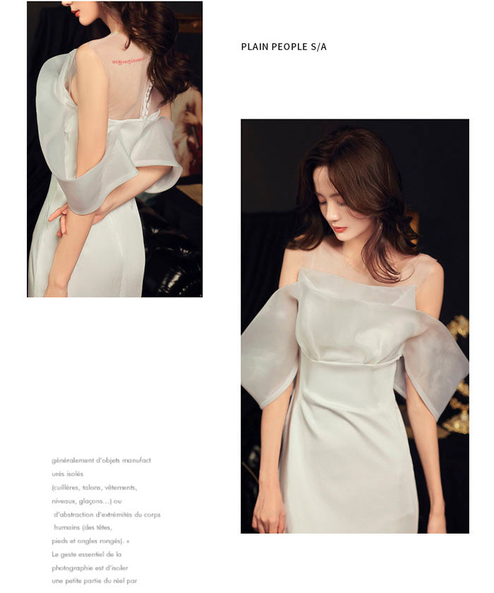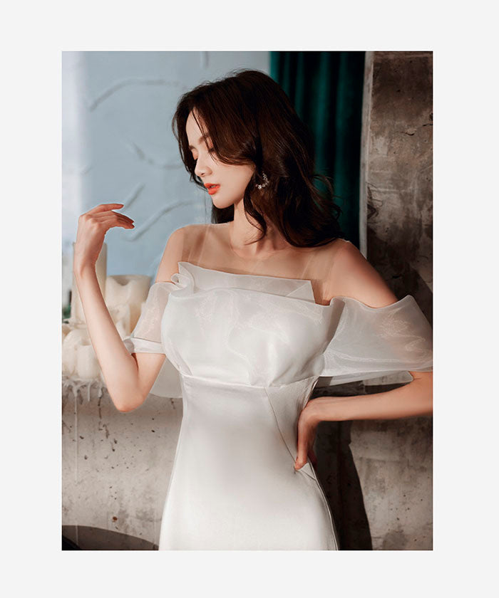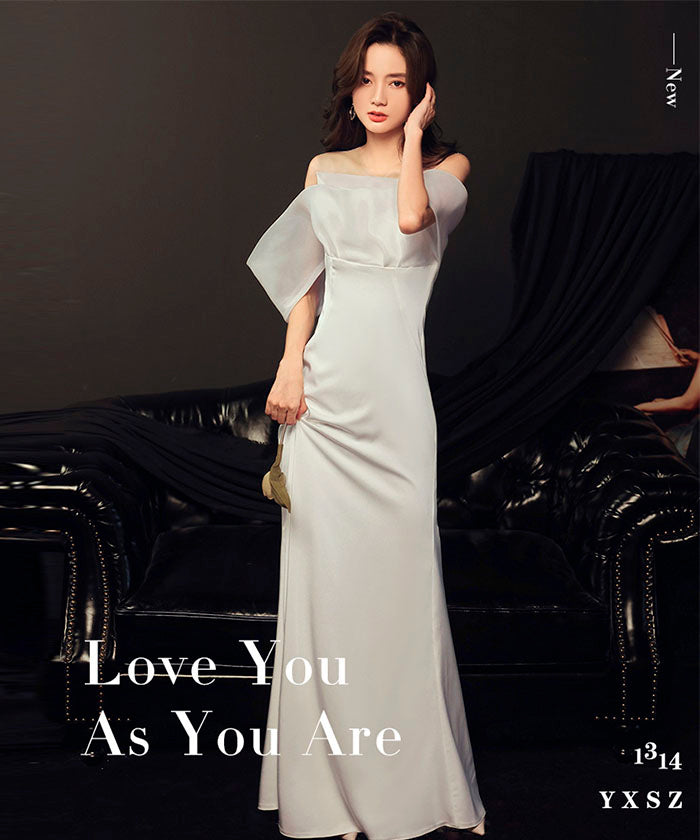 ホワイト ライトウェディングドレス 結婚式 婚約パーティー オフショル ライトガーゼ ワンショルダー ウエスト フィッシュテール 宴会 イブニングドレス