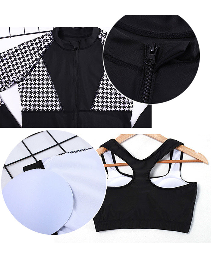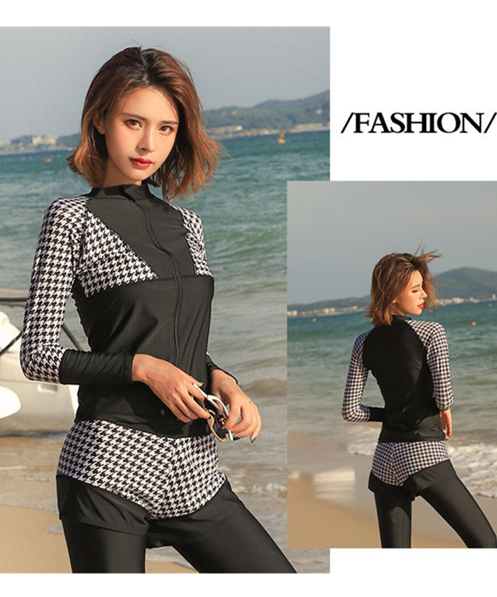 水着レディース 50代 40代 30代 20代 10代 セパレート 可愛い 5点 セット 日焼け 防止 長袖 ラッシュガード 千鳥格子柄 スポーツ サーフィン 黒 グレー 海 プール